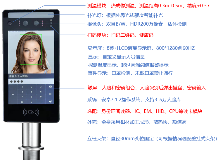 支持测温、刷卡、密码、扫码、识别口罩等多种识别方式。支持各种射频卡及身份证的识别。支持触屏密码输入和设置设备参数并自定义语音播报内容以及自定义显示内容。
