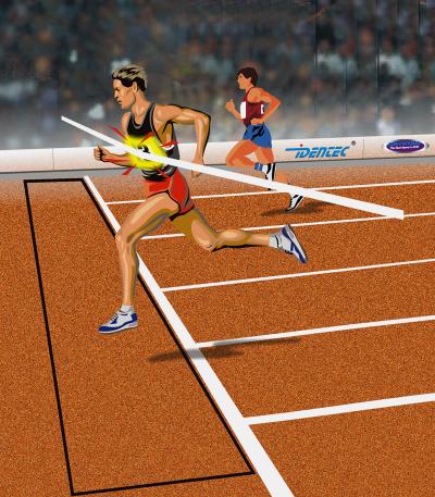 AI 终点画一个一米左右的区域,可以识别有物体闯入区域,但是不能区别是谁,在附近走动人员被识别到会出错。要分辨是谁,需要做到人脸识别。但是在跑道上跑步人脸很难全部识别,存在低头、遮挡等情况,人在跑动过程中,脸上出汗、人脸因热变形等均会导致识别错误。