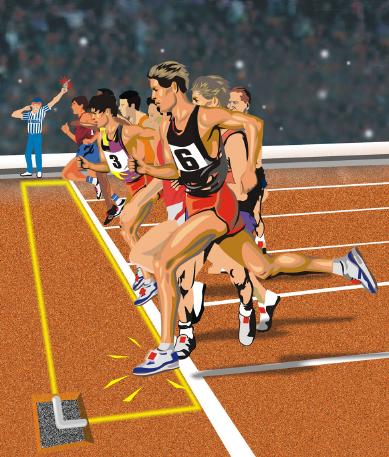 对于在田径场、滑冰场等场内进行的中、长距离比赛,运动员要在场内行进几圈到几十圈,需要记录运动员行进的圈数,以便确认运动员是否跑完全程。为此在终点线安装一套系统天线及读卡器,并给每个运动员携带能发出不同特征信息的感应卡,当运动员听到发令枪声,起跑后,运动员每经过一次终点线时,位于终点线处的天线接收到运动员携带的感应卡发出的信号,经读卡器处理后,识别出该位运动员的身份,并记录下相应圈数,从而完成了自动记录所有参赛运动员行进圈数的目的。